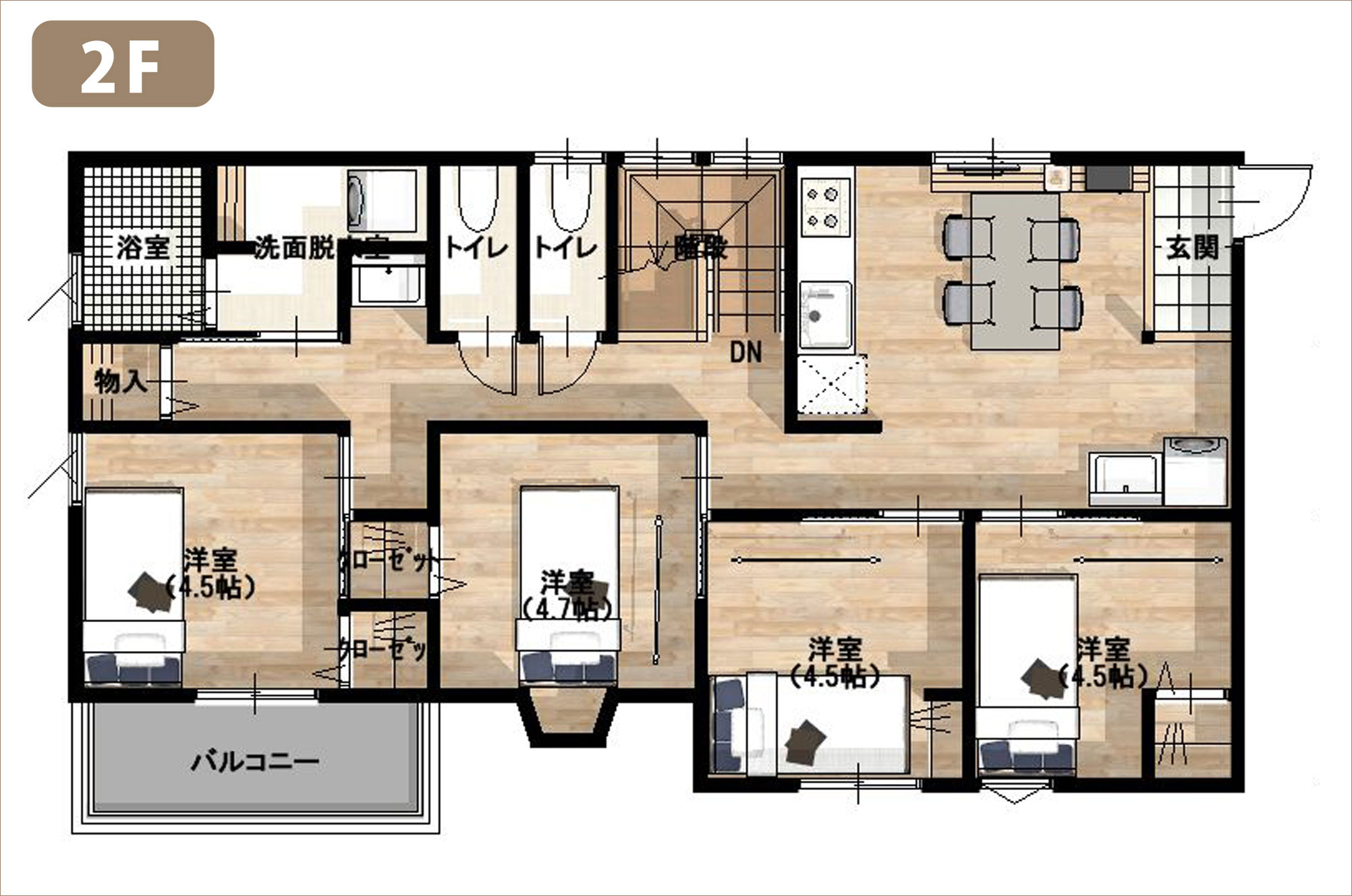 システムキッチン、カップボード、冷蔵庫、ガスコンロ、電子レンジ、 炊飯器、共用部エアコン、ユニットバス1、トイレ2、洗面2、洗濯2、WiFi。
